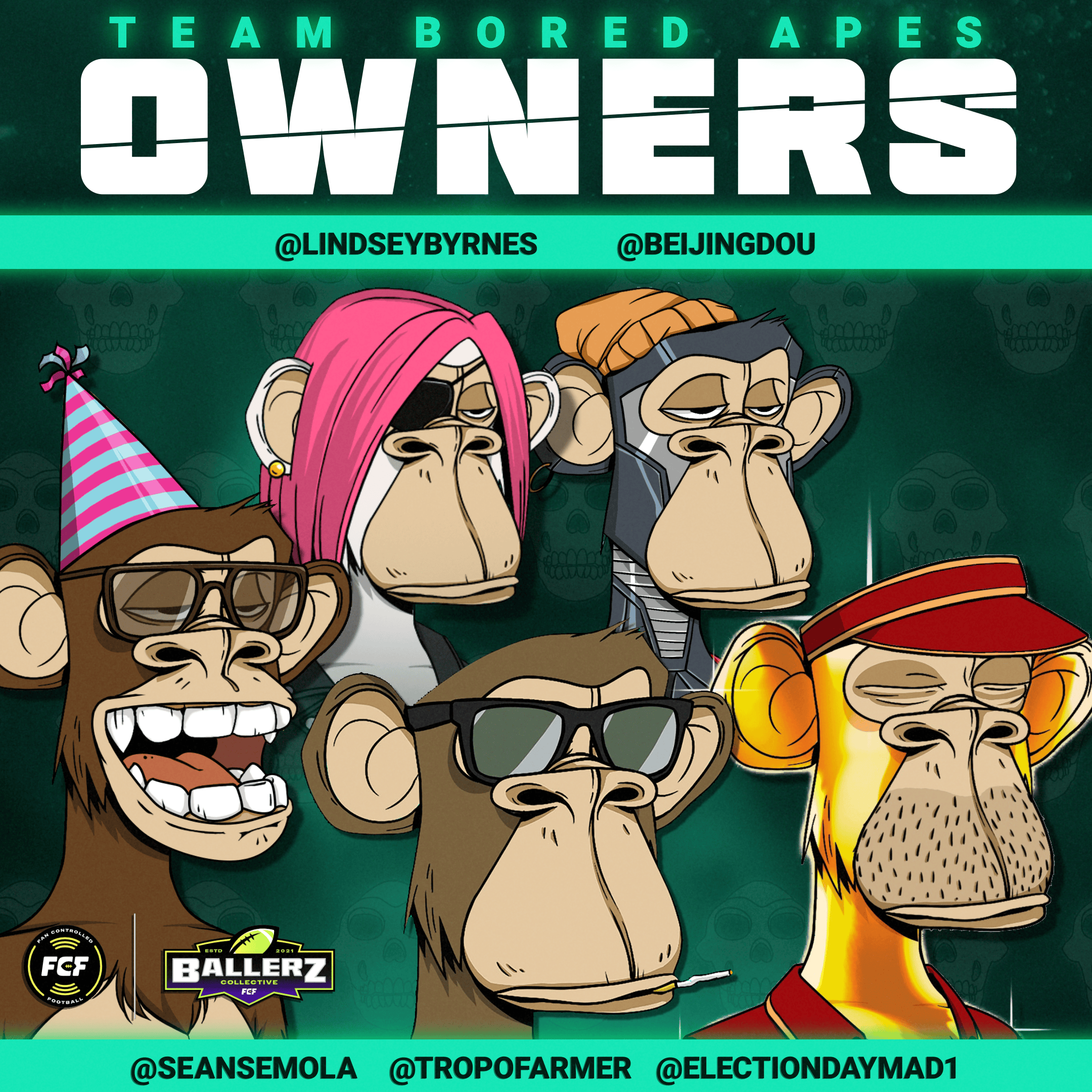 - The Bored Ape Yacht Club, owned by a group including TropoFarmer, Josh Ong, Jerseyborn, Franklin, Lindsey Byrnes, BenJammin, NFTsAnonymous, Jeff Nicholas, and Spr3adsh33t